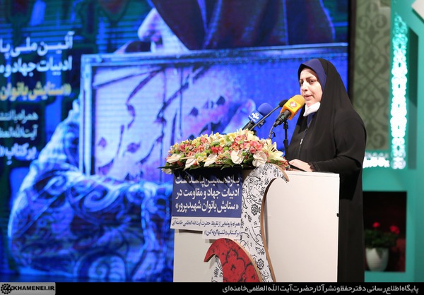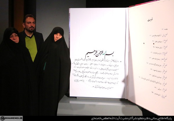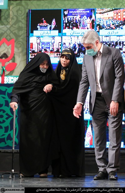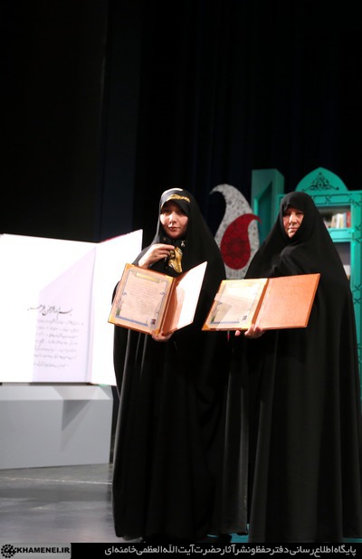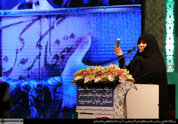 دیگر مادران و همسران شهدا هم آرامآرام از راه میرسند. میان همۀ این چهرهها که هرکدام نشانی از شهادت و صبر بر سینه دارند، چهرۀ ویژهای حضور دارد: حاجخانم کارگر که هم فرزند شهید است، هم مادر، خواهر و همسر شهید! داغ پنج شهادت بر یک سینه. حاجخانم را بهزحمت، با کمک صندلی چرخدار آوردهاند. علیرغم بیماری، قبول زحمتکرده تا موقع رونمایی از تقریظ و اهدای هدایای رهبر، شانهبهشانۀ نویسندۀ جوان باشد. همین هم میشود. حاجخانم راضی نمیشود روی صندلی چرخدار بماند. خانم نویسنده به استقبالش میرود و دستش را محکم در دست میگیرد. در تمام مدت رونمایی و اهدای جوایز، دست نویسنده در دست این اسطورۀ صبر میماند؛ آنطور که قرآن تقدیمی آقا و هدیه را کناردستیها برایش میگیرند و نگه میدارند.