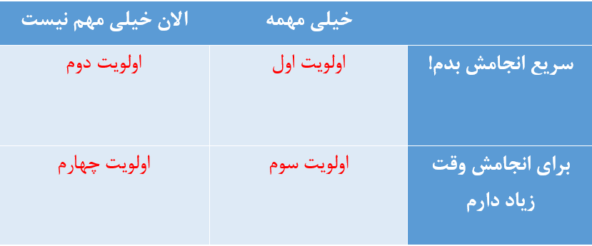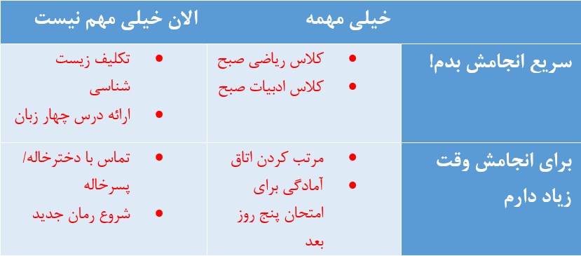 این نمونه را ببینید. اگر این جدول یک روز تو باشد، باید بروی سراغ اولویت اول و با تمرکز کامل بنشینی سر کلاس. بعد، همانطور که تمرکز کردی، تکلیف زیستشناسی را انجام بدهی و بفرستی. شاید بتوانی بین تکلیف زیست و ارائه درس زبان، اتاقت را مرتب کنی. اینجوری هم تنوع ایجاد کردی و هم استراحت کردی. به این میگویند سازماندهی کارها به اضافه مدیریت زمان! آخر روز اگر وقت داشتی، به اولویتهای چهارم هم برس. راستی! یادت نرود هر کاری که انجام شد، رویش خط قرمز بکشی. خیلی کیف دارد!